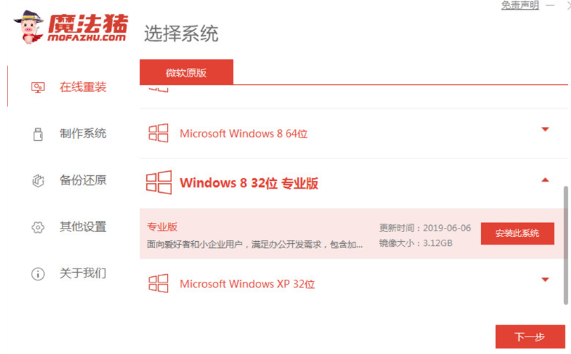 1、下载安装魔法猪装机软件,点击在线安装,选择要按装的系统版本。