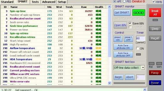 S.M.A.R.T (Self-Monitoring Analysis and Reporting Technology) 硬盘自我检测功能,点击 Get Smart 就可以让硬盘自我检测是否有故障。如果没问题,就会如下图所示一样,显示 GOOD 字样。不过这只是一些基本的信息,如果要检查坏道,还是要去 Test 那里。