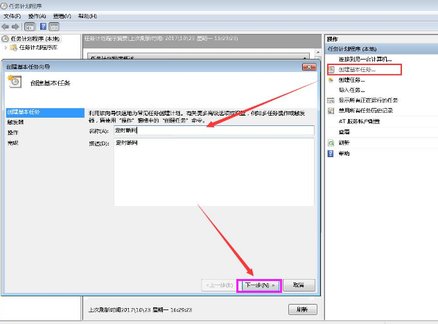 在打开的任务计划程序内点击“创建基本任务” 输入名称,点击“下一步”。