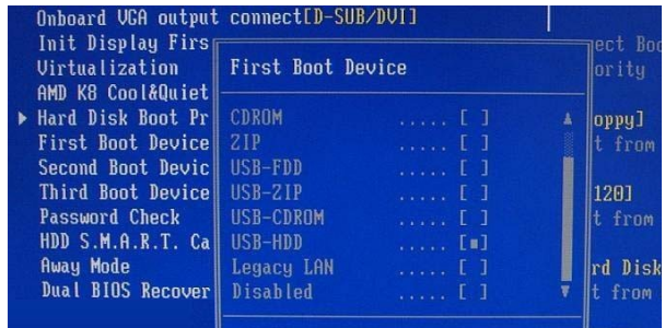 bios设置U盘启动,我们只要将First Boot Device设置为USB-HDD或USB-ZIP(根据USB启动盘类型确定,另外请提前插入U盘,以让电脑检测到),完成后,同样是按F1O键保存退出。