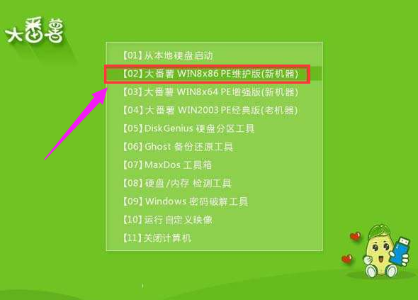 此时进入大番薯主菜单界面,选择【02】大番薯win8×86pe维护版(新机器)并按回车进入