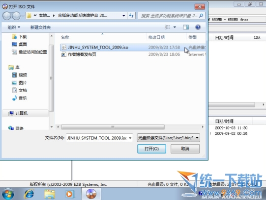 启动UltraISO,点击“文件”菜单下的“打开”按钮,打开已准备好的ISO镜像文件,如JINHU_SYSTEM_TOOL_2009.iso