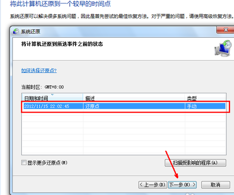 4、启动系统还原后可以选择还原点还原,点击一个时间点的备份还原即可进行还原。