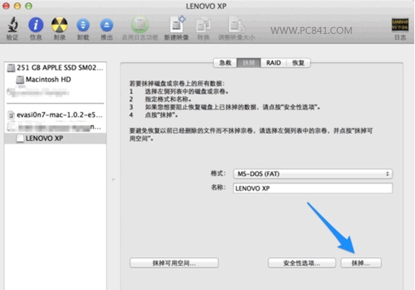 四、之后在点击窗口右下角的“抹掉”按钮,也就是格式化的意思,如图所示:
