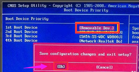 在电脑开机出现第一屏幕时,根据屏幕按相应的键(通常按DEL)即可进入CMOS设置界面,在此界面中选择从“U盘(或可移动磁盘)启动”。