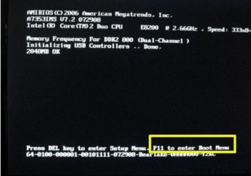 以上是三家不同品牌、不同型号主板在POST期间的屏幕显示情况,请看笔者用黄色框住的部分,稍微有点英语基础的人都看得出来,提示的这个键一定和Boot(引导)有关。没错,屏幕中所出现的这个键就是用来临时改变引导设备的。由于基本上所有的厂商都是定义的这几个键中的一个,所以一些高手在计算机启动时,直接同时按这几个键,总有一个是对的,所以这就出现了本页开始的那一幕。