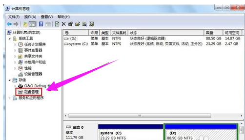 对着“计算机”点击鼠标右键,选择“管理”→“磁盘管理”,进入windows自带的磁盘管理界面