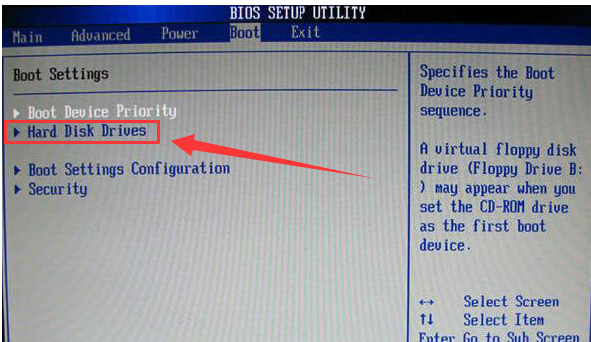 接着使用左右方向键将光标移至“Boot”栏目,再使用上下方向键将光标移至“Hard Disk Drives”项,按回车键确认执行