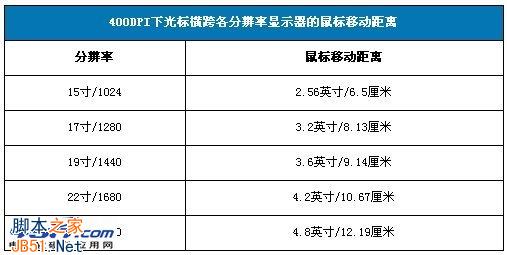 从上图可以看到,假如使用400DPI的分辨率,在1024x768的分辨率下(该分辨率为17寸CRT的最佳分辨率,也是15寸LCD的分辨率),从屏幕最左端移动到最右端,我们仅需要1024/400=2.56英寸=6.5024厘米,800DPI的话仅需要3.25厘米,对于我们日常操作来说还是可以接受的。同理可以得出: