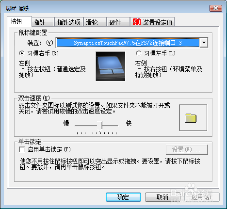 如果不支持组合键关闭触摸板的话,就打开鼠标设置的窗口,然后找到“装置设定值”的选项卡,然后勾选“连接外部USB指向....”这一项,再点击确定即可。那样只要你插上鼠标,那触摸板就会自动关闭了。(此操作需要Synaptics驱动,这个驱动可以到官网进行下载。)