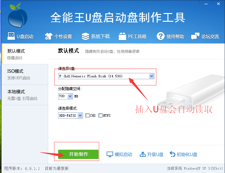 第二步:安装后以后打开全能王U盘启动盘制作工具界面插上U盘,程序就会自动识别U盘,如截图: