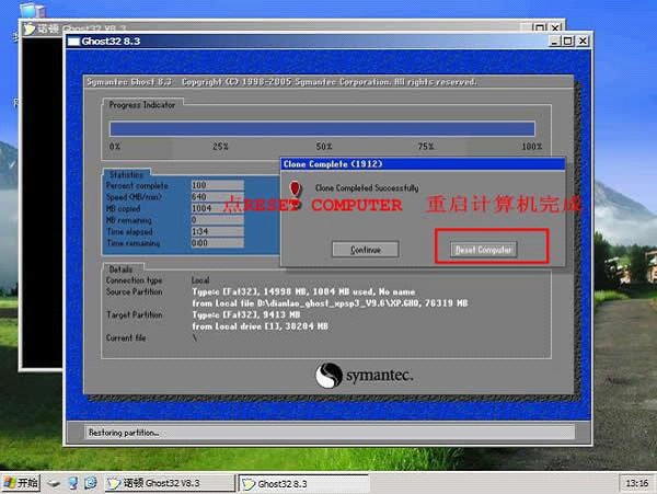 当GHOST镜像恢复完毕后,即可重启进入系统。至此,用U盘安装操作系统完毕!你可以忘掉没有光驱无法安装操作系统的烦恼了。