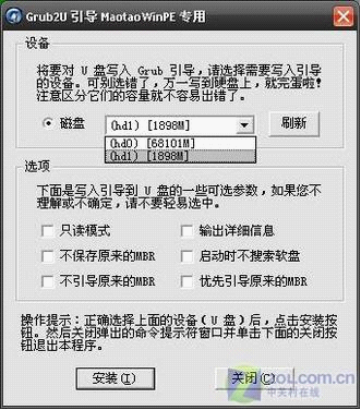 引导部分:这里要说明一下,在“设备”里有两个选项,一个是电脑的硬盘,一个是要制作的U盘。这里一定要选对U盘而别选错硬盘,从大小就能分出来哪个是U盘。笔者的U盘是2G的,所以应该选择(hd1)[1898M]。下面的“选项”部分可以不用管,默认不勾选任何参数就行。确认好以上步骤后,点“安装”然后进行下一步。