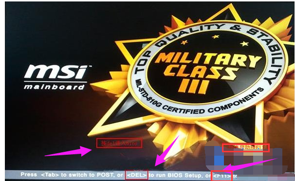 首先将快启动u盘插到主机usb接口上,重启电脑,看到微星logo后按del键打开设置界面