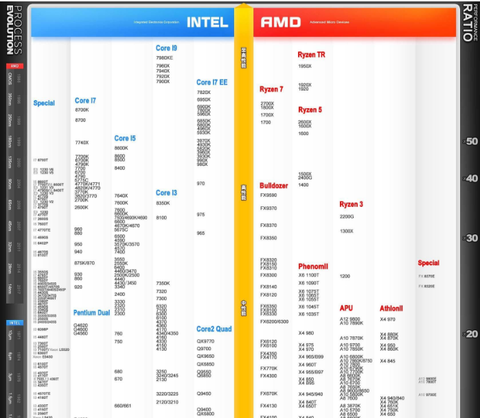对比了intel Core i3、i5、i7、i9酷睿系列,AMD Ryzen、FX、A8、A10、A12等系列的cpu处理器性能