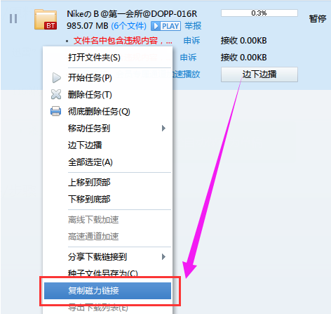 右键点击所下载文件/种子均可,点击【复制磁力链接】