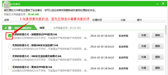 在隔离内容中找到您需要恢复的文件,然后在左边将其勾选中,最后点击右下角的“恢复所选”,被隔离的文件将恢复到原来保存的路径中