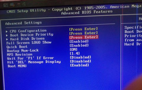 然后,进行系统后选择第二个advanced bios features(bios高级设置),进入高级设置以后,找到hard disk drives选项(设置硬盘驱动)。