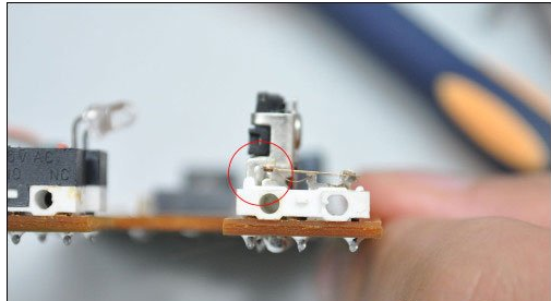 将微动开关的触点以及卡座上的触点,用砂纸或者锉刀进行处理。由于长时间使用,这两个点氧化就造成了鼠标双击、拖曳操作困难等失灵故障。