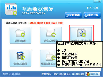 1、单击"U盘手机相机卡恢复" 模式,本模式可以恢复:各类原因丢失的U盘和内存卡的数据。