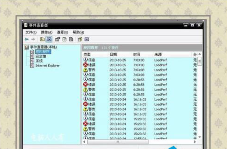 6、详情可以在开始→运行中输入:EventVwr.msc,回车后打开事件查看器,注意检查其中的系统日志和应用程序日志中标明错误的项。