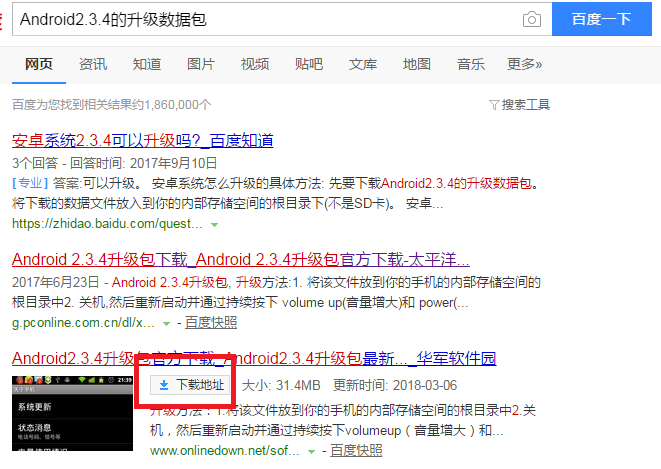 第一步:先要手机下载Android2.3.4的升级数据包,我用的电脑给你搜了一下。