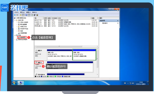 2、在管理窗口内点击磁盘管理,确认u盘的序号是磁盘几。