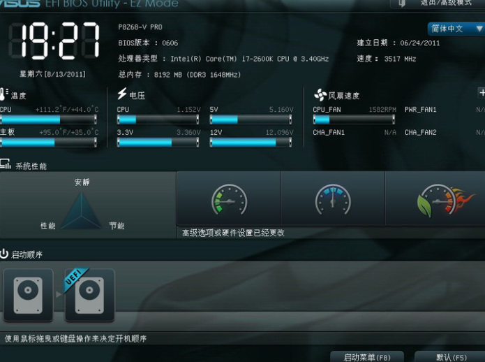 1、首先我们进入华硕主板bios界面,该界面显示了主板的基本信息,cpu信息和内存,温度、电压和风扇温度等等各种电脑硬件的基本信息。