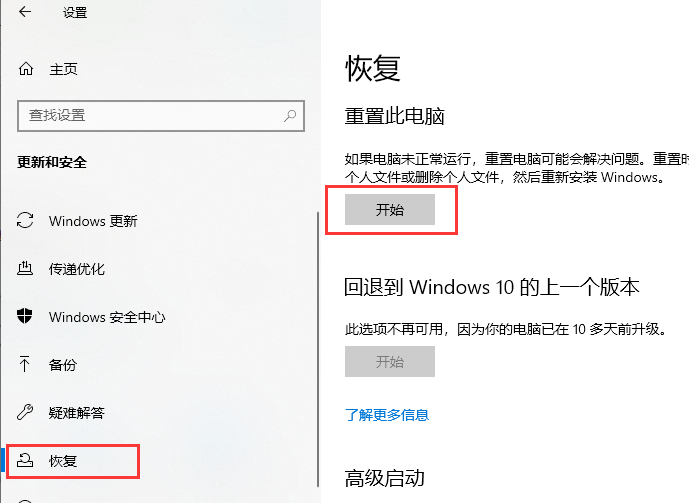 2、在设置界面中,找到“恢复”,重置此电脑点击“开始”。