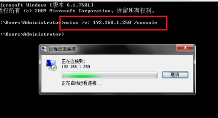 6、在命令提示符中输入“mstsc /v: 192.168.1.250 /console”命令,回车即可。“192.168.1.250”即远程连接电脑的ip地址。