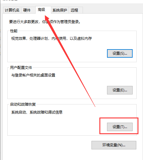 3、选择“高级”选择,在启动和故障恢复中,点击“设置”。
