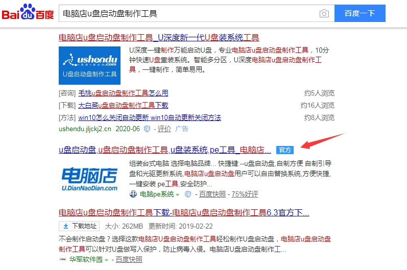 1、百度搜索电脑店u盘启动盘制作工具,找到带有官方的图标链接并打开。