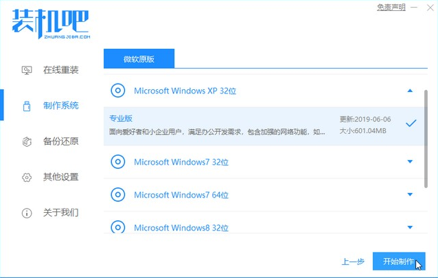 4.检查需要安装的XP系统,然后单击右下角的“开始制作”按钮。