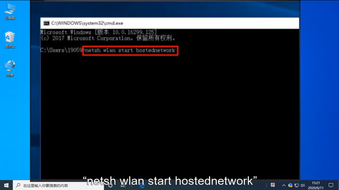 4、在命令提示符中输入“netsh wlan start hostednetwork”即可开启网络。