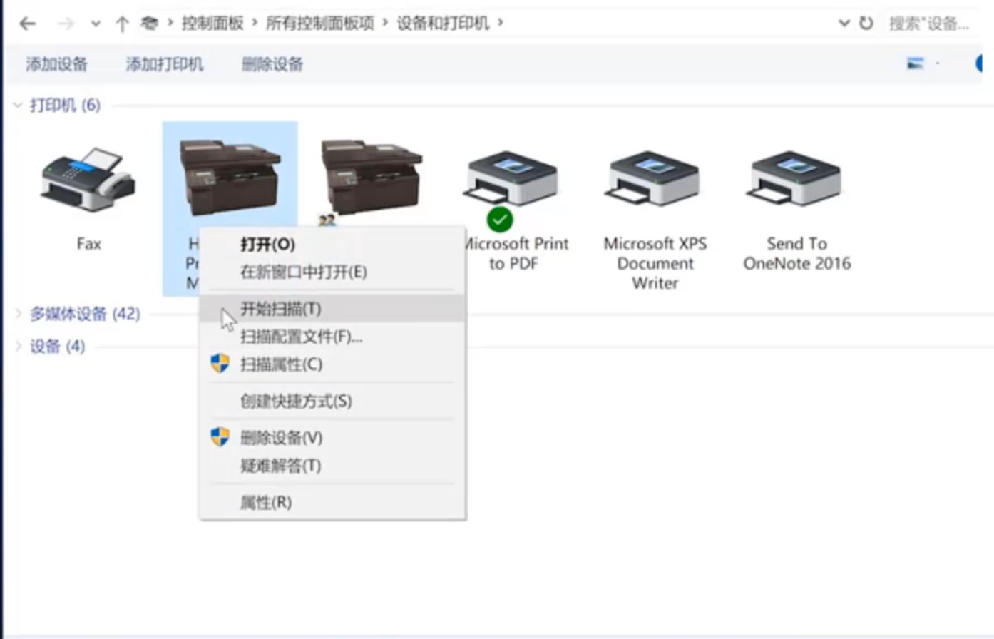 5.接着鼠标右键点击打印机,在弹出的菜单下选择“开始扫描”。