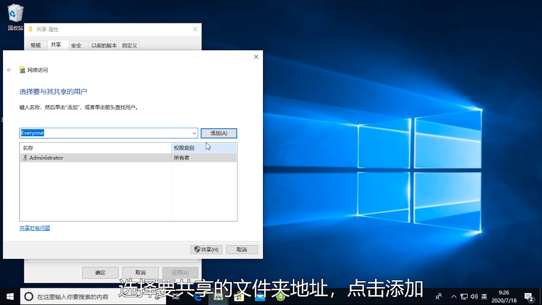 3、右键点击需要共享的文件夹打开属性,点击共享,然后设置添加一个Everyone用户。