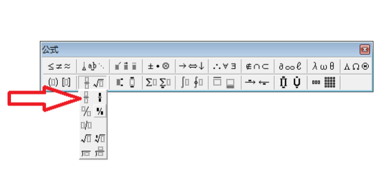 6、点击“公式编辑器”后,找到第二排左数第二个选项,点击,找到第一个类似分数的标志,并点击。