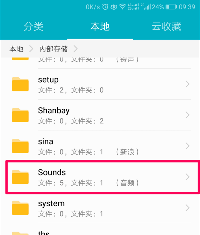 4、手机的所有文件夹都存储在内存中。在这些文件夹中,“声音”文件夹是存储我们的手机录音文件的文件夹。我们点击“声音”进入,如下图: