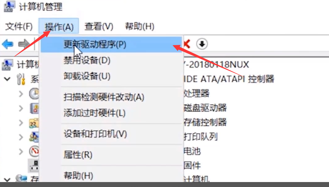 6、等待卸载完成后,找到左上角的操作,在里面选择:更新驱动程序,重新安装网卡驱动,安装完成后就可以正常上网啦。