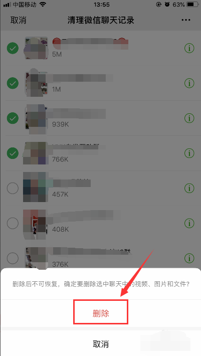 7、在弹出的界面中,选择“删除”,等待微信删除聊天内容完成,如下图所示
