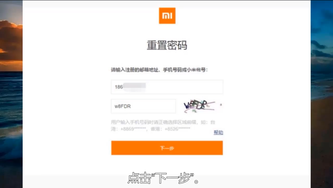 3、输入自己之前注册账号时的邮箱、手机号码或者小米账号,然后输入验证码后点击下一步。