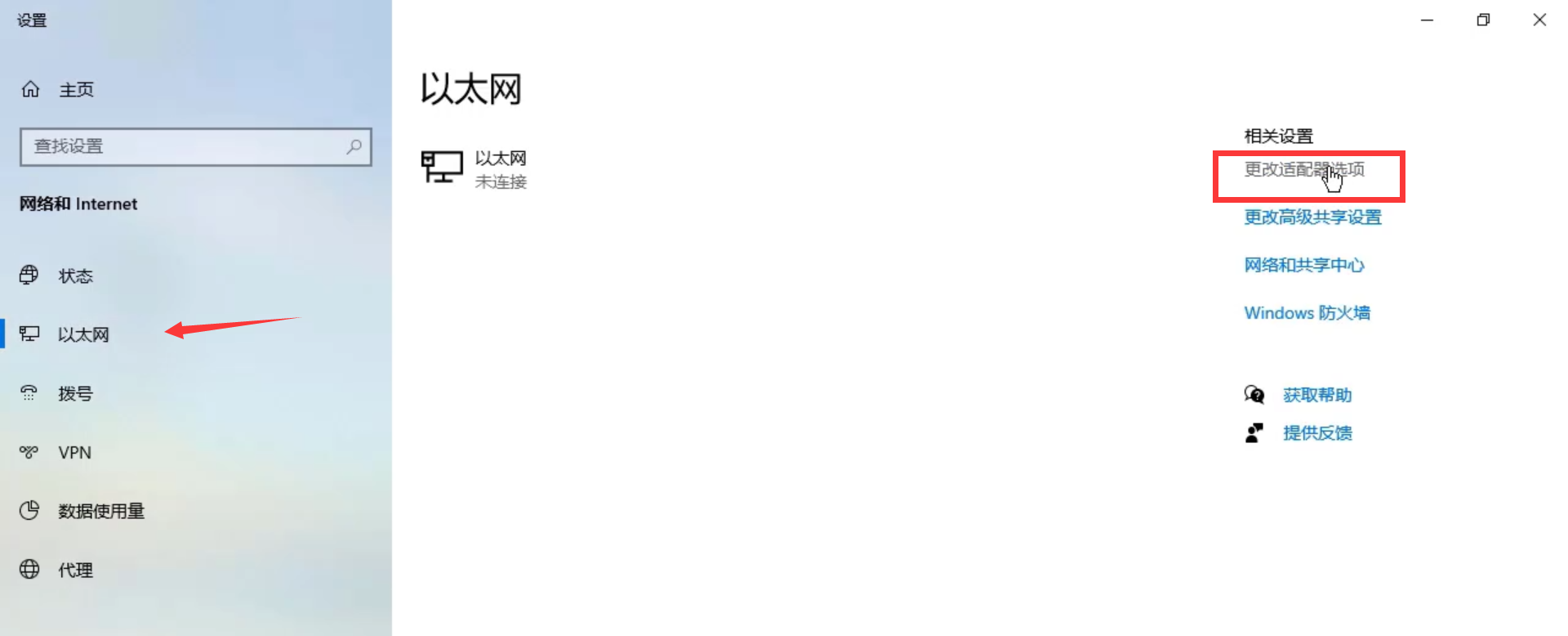 2、点击左侧的以太网,然后点击右侧的更改适配器选项。