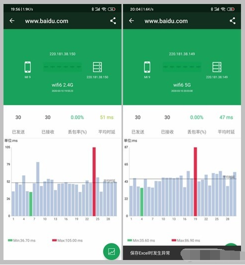 ▼delay和linksys产品之间没有太大区别。下图是ping百度测试的半分钟。可以看出,2.4G和5G频段基本上稳定在50ms左右。这种延迟的性能是完全可以接受的。