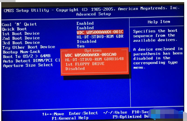 3、进入到下一个页面后,移动到1st Boot Device并回车,在弹出的提示框里选择WDC WD5000AAKX(代表硬盘)回车,按下F10保存后即可。