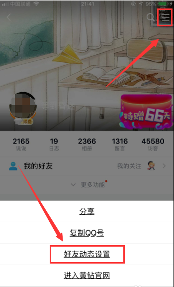 3.单击右上角的三条水平线,然后在弹出选项中单击“朋友动态设置”。