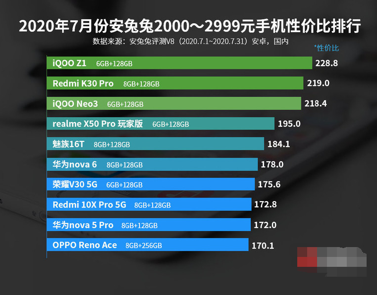 最近安兔兔官方公布了2020年7月份各价格段位手机性价比排行榜单。主要是1500以下、1500-2000元、2000-3000元、3000-4500元、以及4500以上。