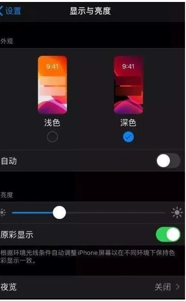 4、然后我们打开系统设置里面的显示与亮度,将浅色按钮换成深色按钮。可以切换微信的深色夜间模式。