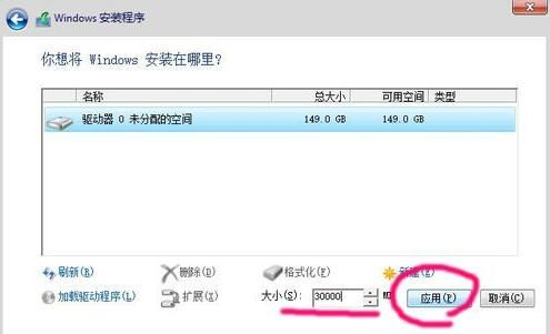 2、可以把30G的内存划给C盘,当然也根据自己的实际需要调整。(注意,30G=30000M),随后选择应用。