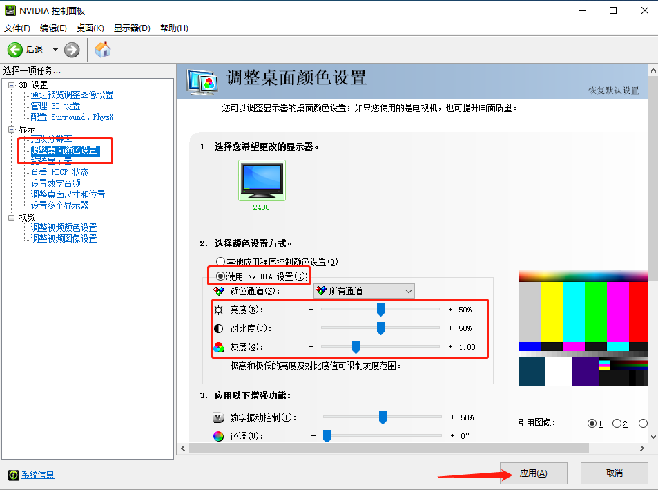 2、然后选择调整桌面颜色设置,在右边点击使用NVIDIA设置。然后我们就可以调整屏幕亮度及颜色了。