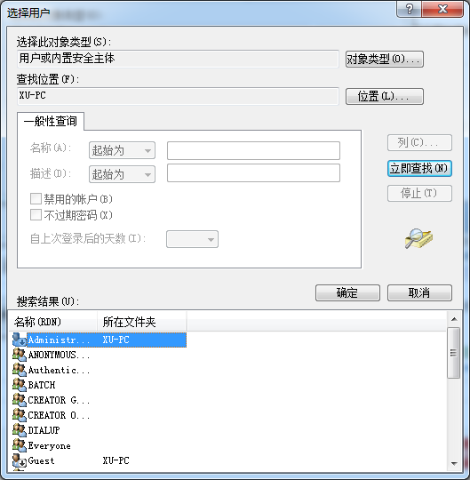 2、完成上面步骤后,点击”选择用户“,在弹出的页面中选择”添加“—”高级“—”立即查找”。